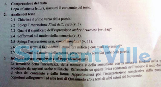 dell’Europa tra il 1914 e il 2014″.Quasimodo è stato scelto per una delle tracce proposte ai maturandi 2014, quella sull’analisi del testo: l’indiscrezione, rimbalzata su Twitter, è stata ripresa da SkyTg24 e da altri network radiotelevisivi. Salvatore